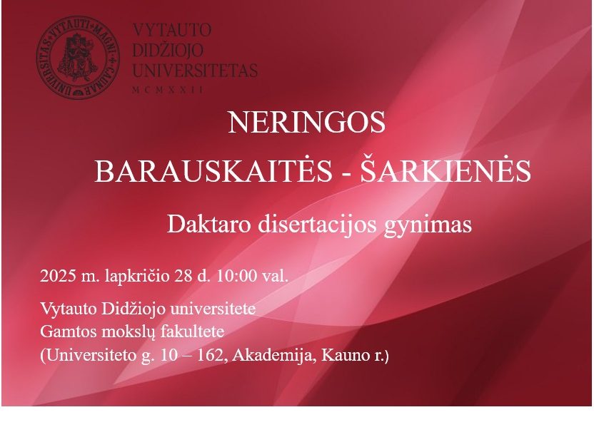 Lapkričio 28 d., 10 val., VDU Gamtos mokslų fakultete (Universiteto g. 10–162, Akademija, Kauno r.) bus ginama Neringos Barauskaitės-Šarkinienės daktaro disertacija „Elektriniais laukais pagrįstų priešvėžinės terapijos metodų sukeltas „Bystander“ efektas“ (gamtos mokslai, biologija N 010).