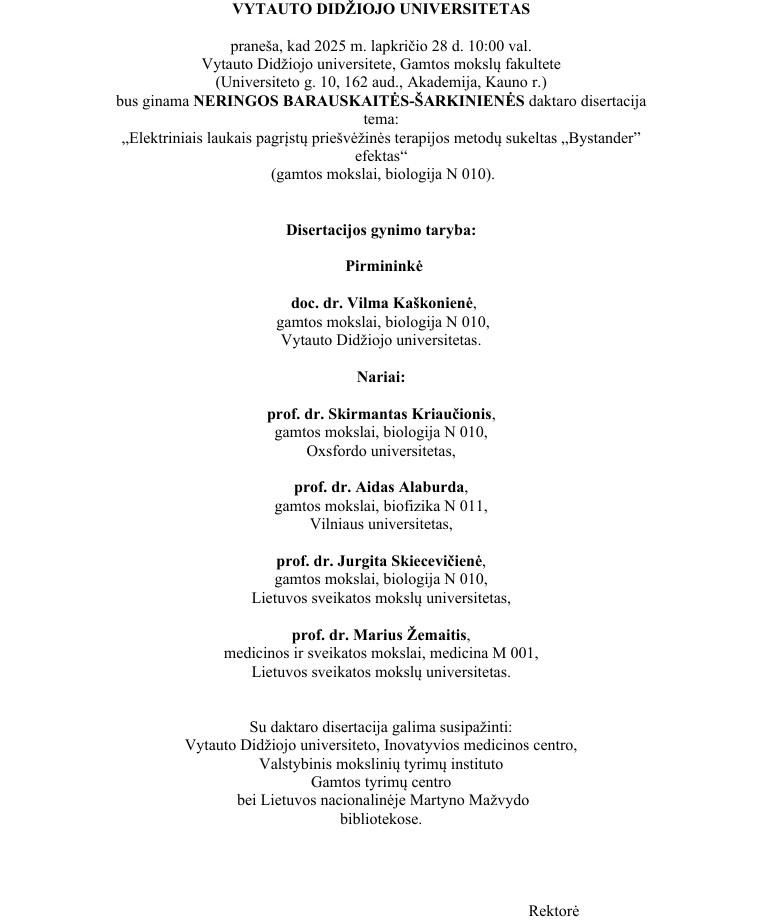 Lapkričio 28 d., 10 val., VDU Gamtos mokslų fakultete (Universiteto g. 10–162, Akademija, Kauno r.) bus ginama Neringos Barauskaitės-Šarkinienės daktaro disertacija „Elektriniais laukais pagrįstų priešvėžinės terapijos metodų sukeltas „Bystander“ efektas“ (gamtos mokslai, biologija N 010).